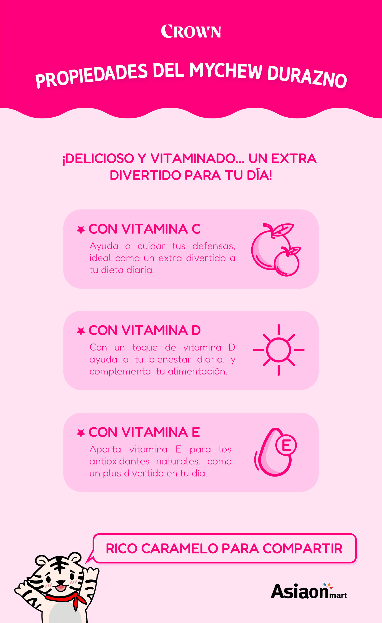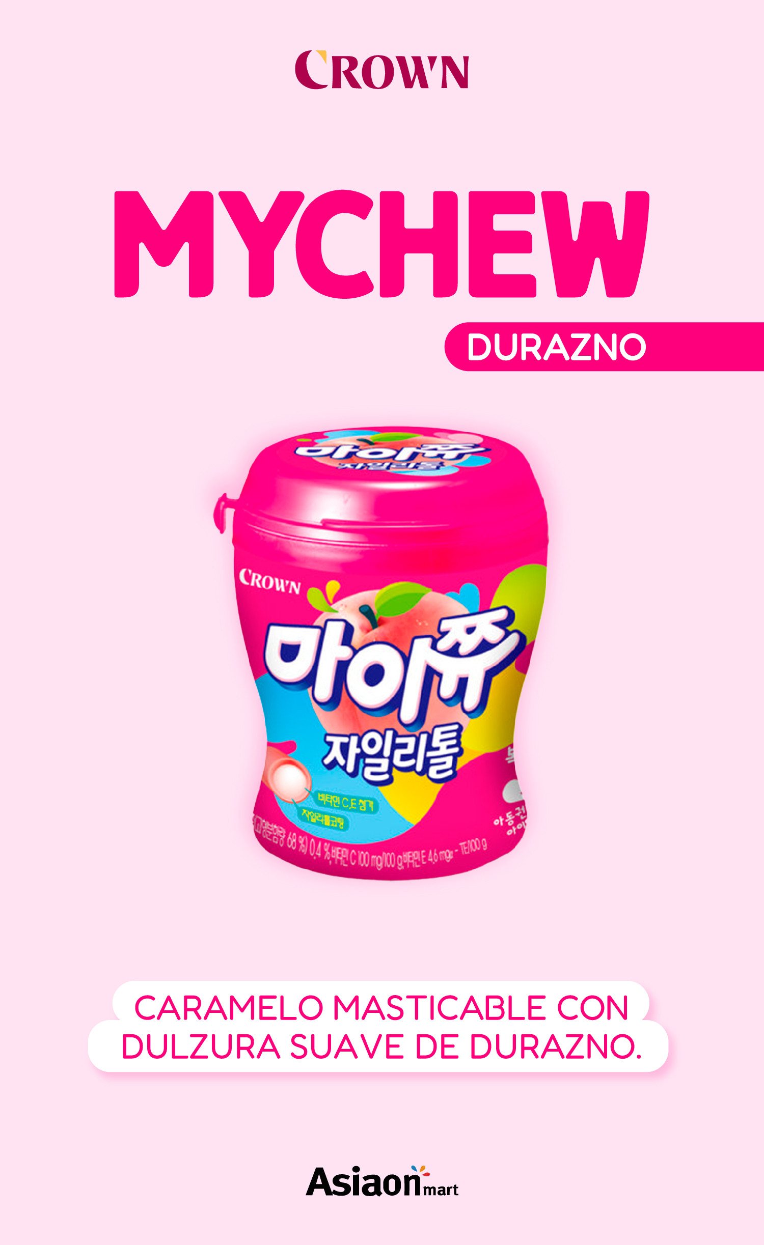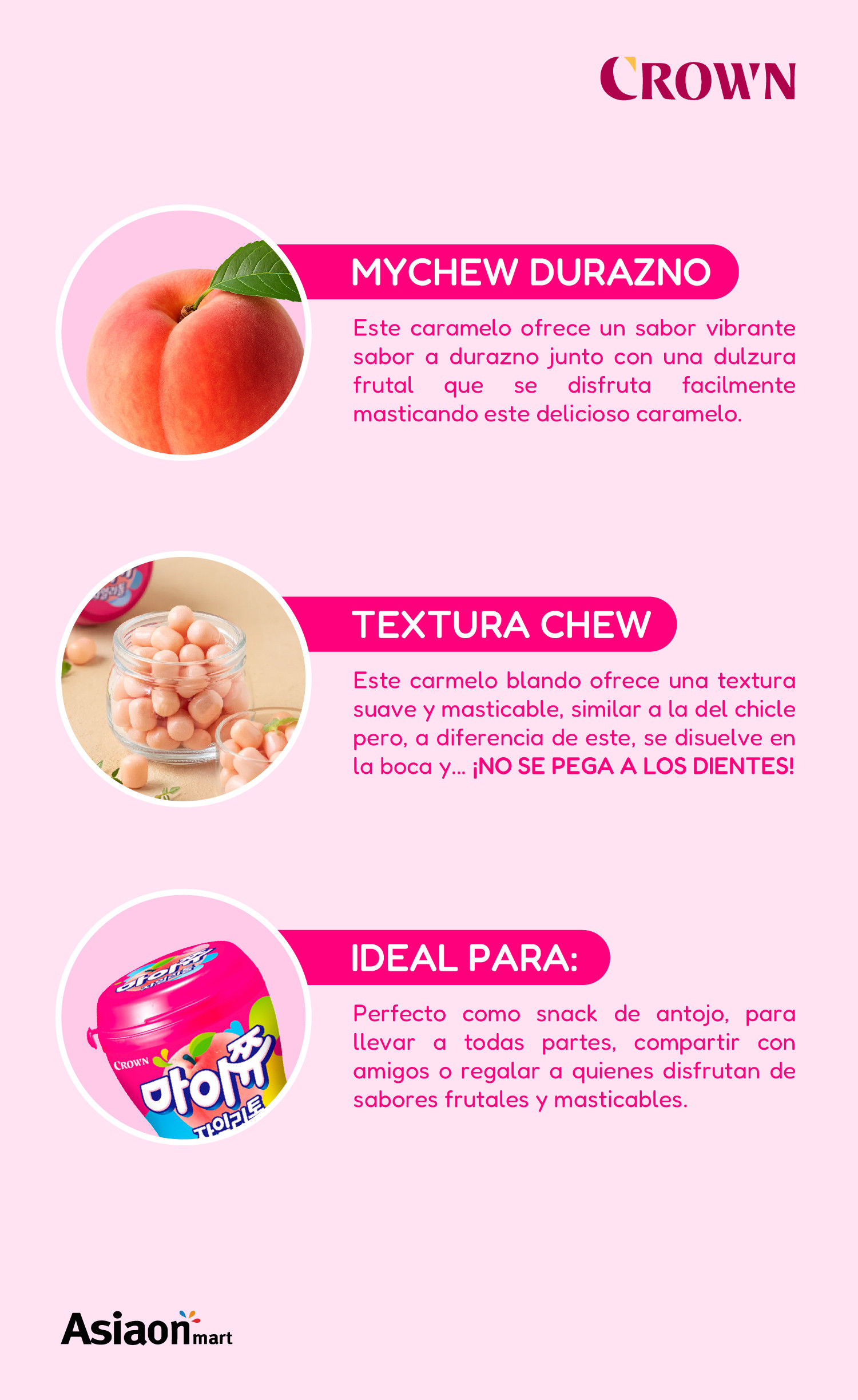 Crown Mychew Sabor Durazno 112 gr son deliciosos dulces chiclosos con una gran popularidad en Corea. Cuentan con una textura única la cual evita que el dulce quede pegado a los dientes. Además contiene Vitamina C.
