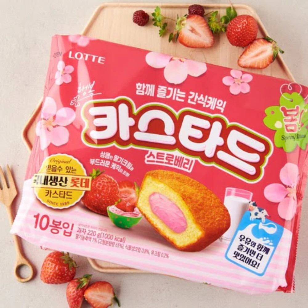 Lotte Custard Cake Fresa 10 Pzas es un bocadillo muy popular en Corea. Son pastelitos rellenos de una deliciosa crema pastelera sabor fresa.