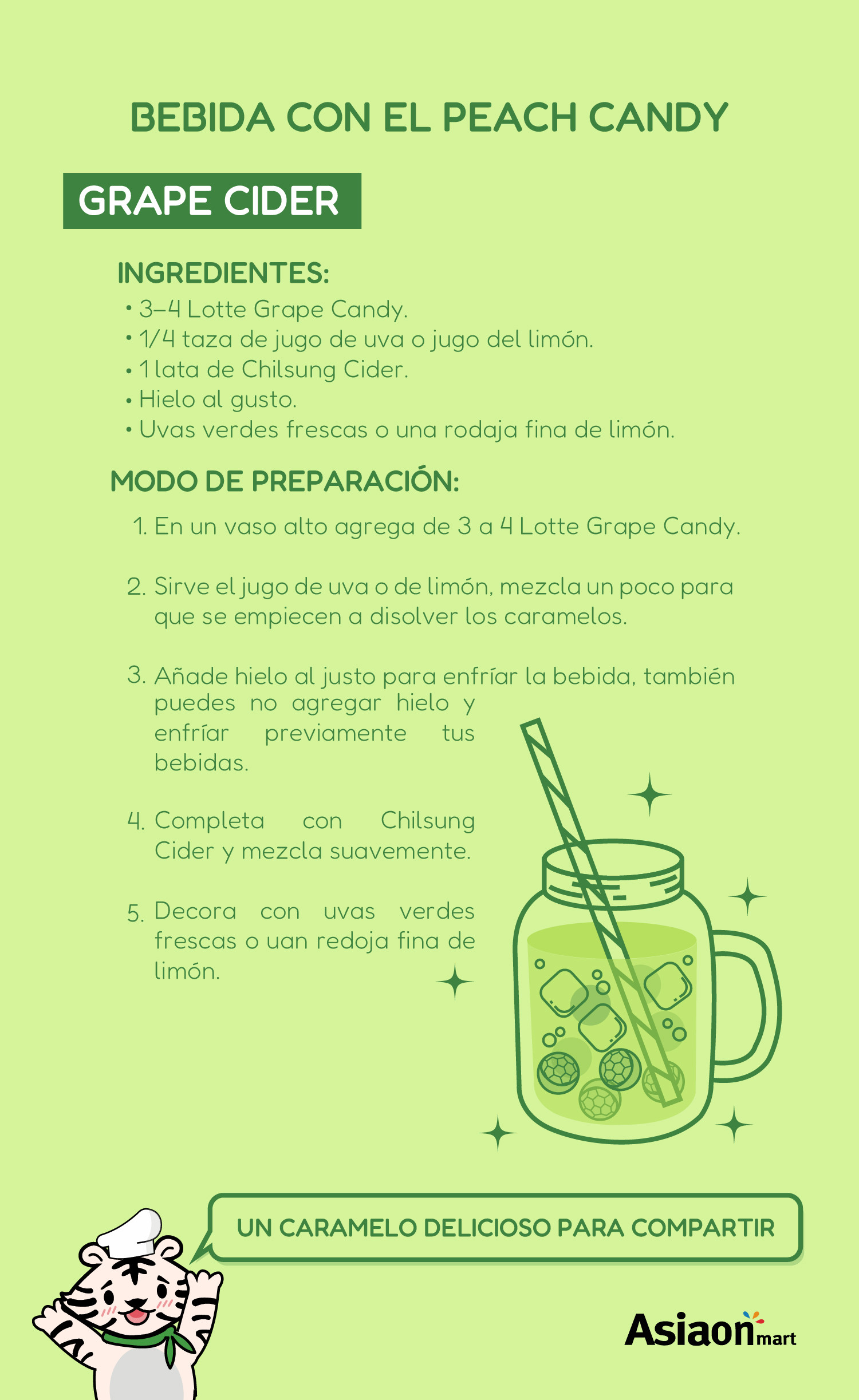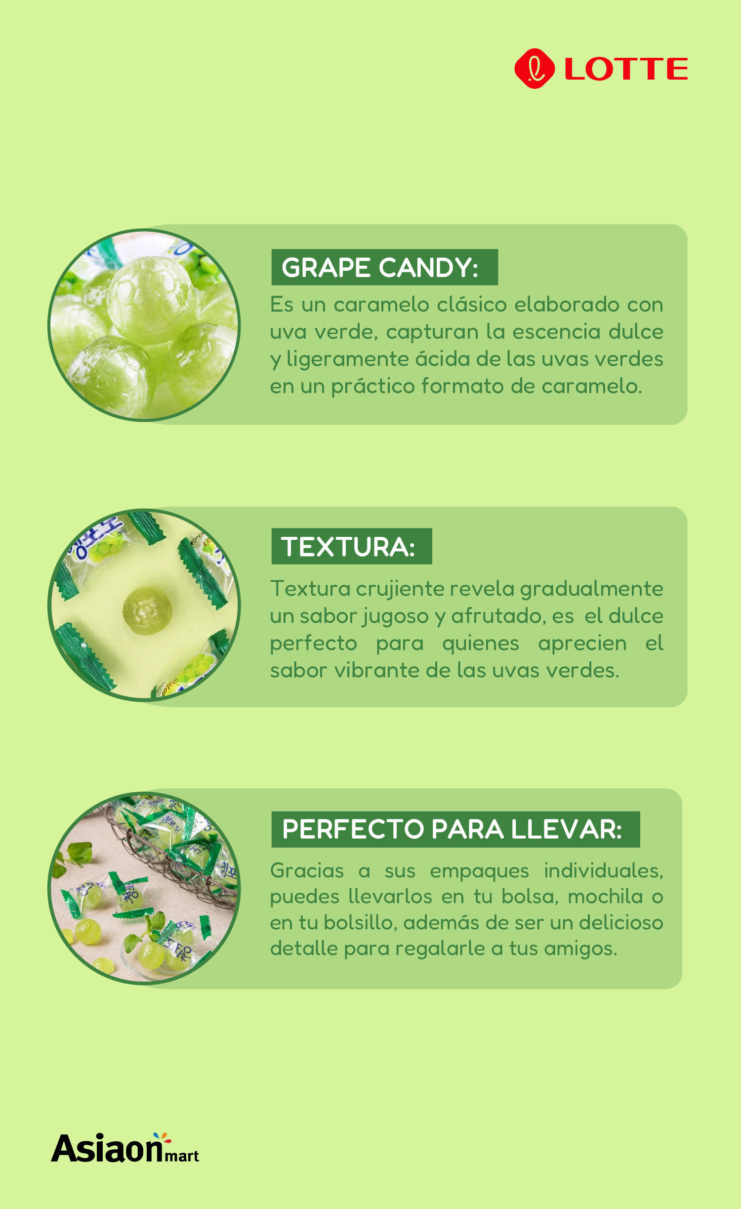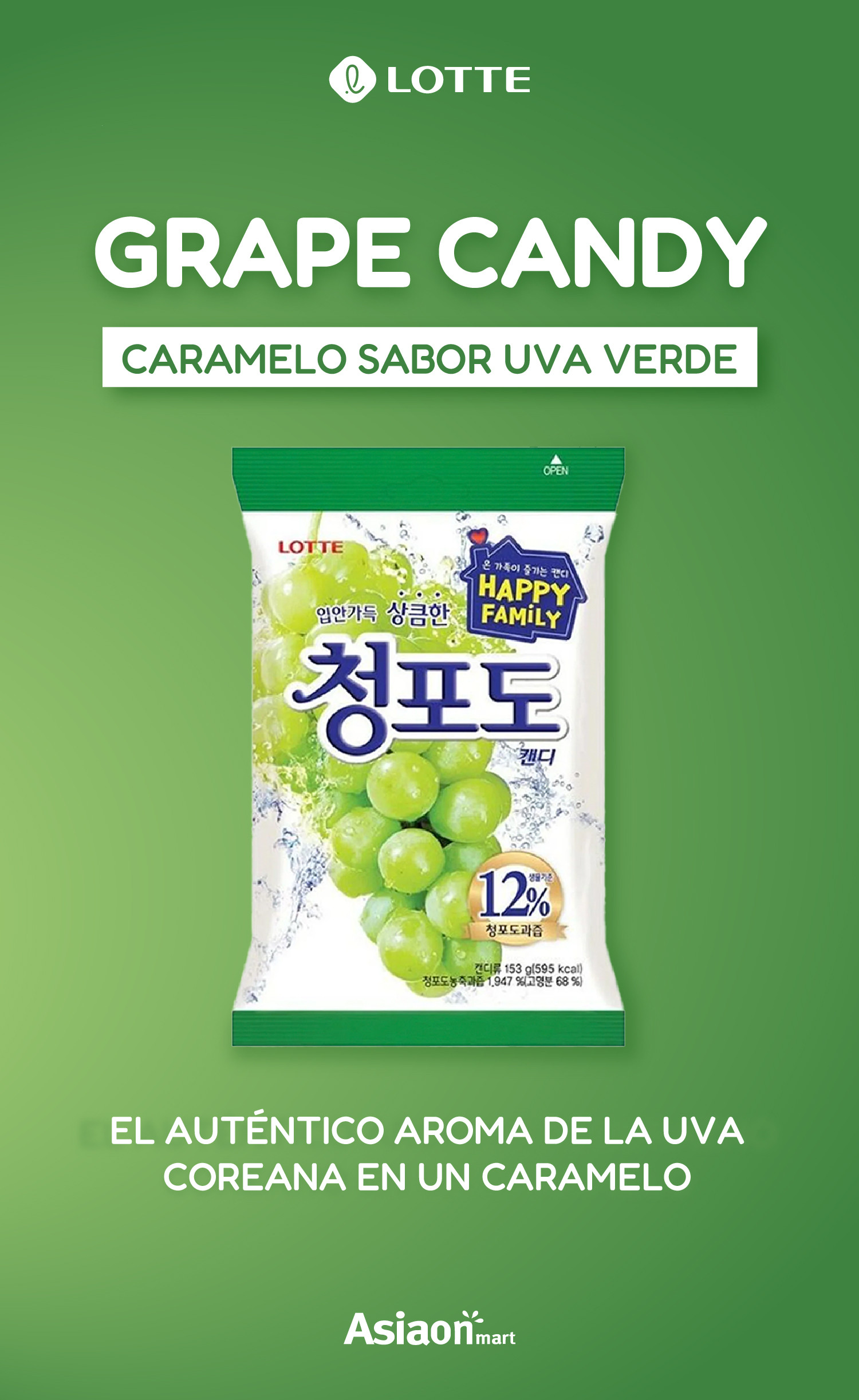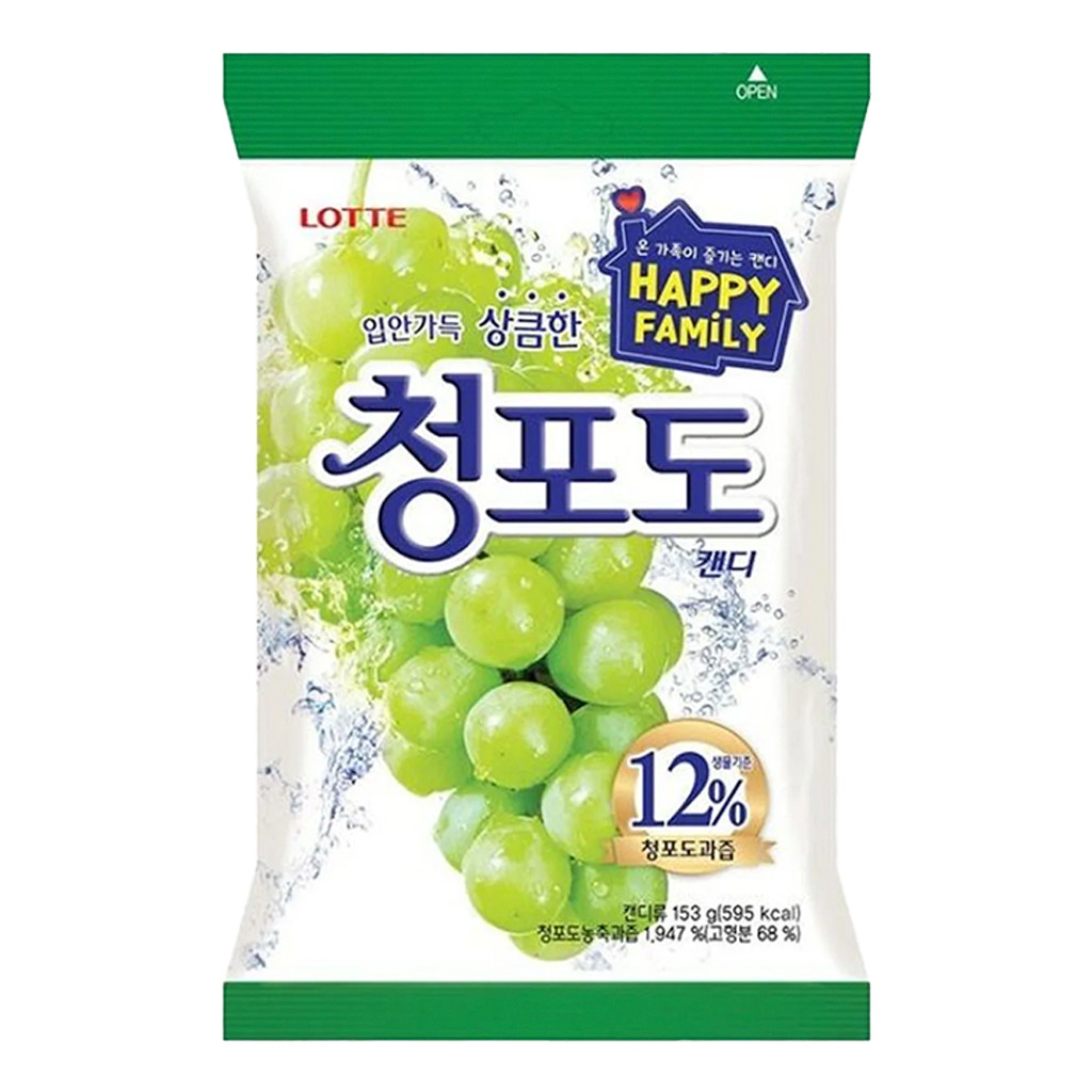 Lotte Dulce de Uva Verde 153gr es un dulce macizo con un delicioso sabor a uva verde, su sabor llenará tu boca, son especiales para después de comer. Está elaborado con jugo natural de uva.