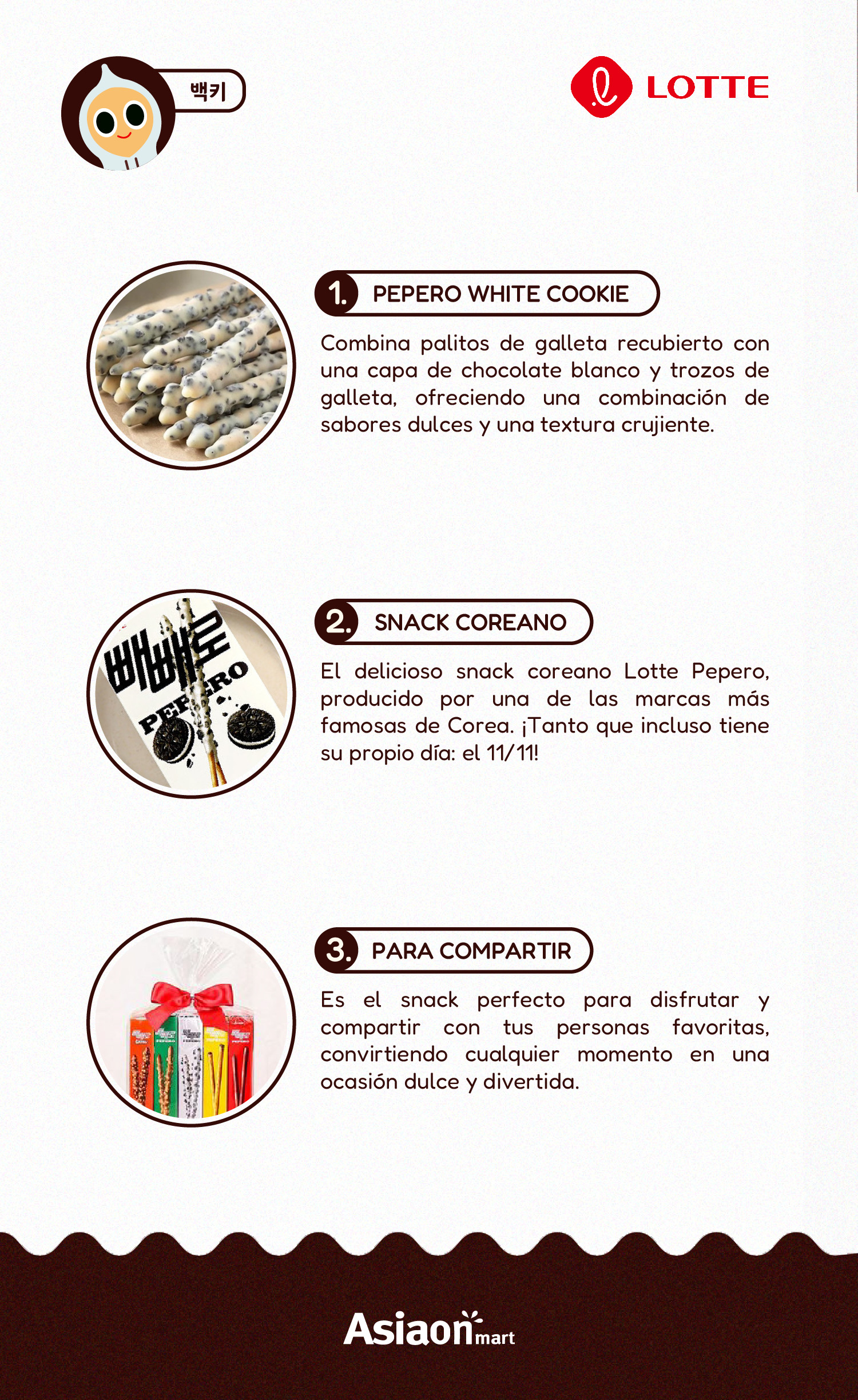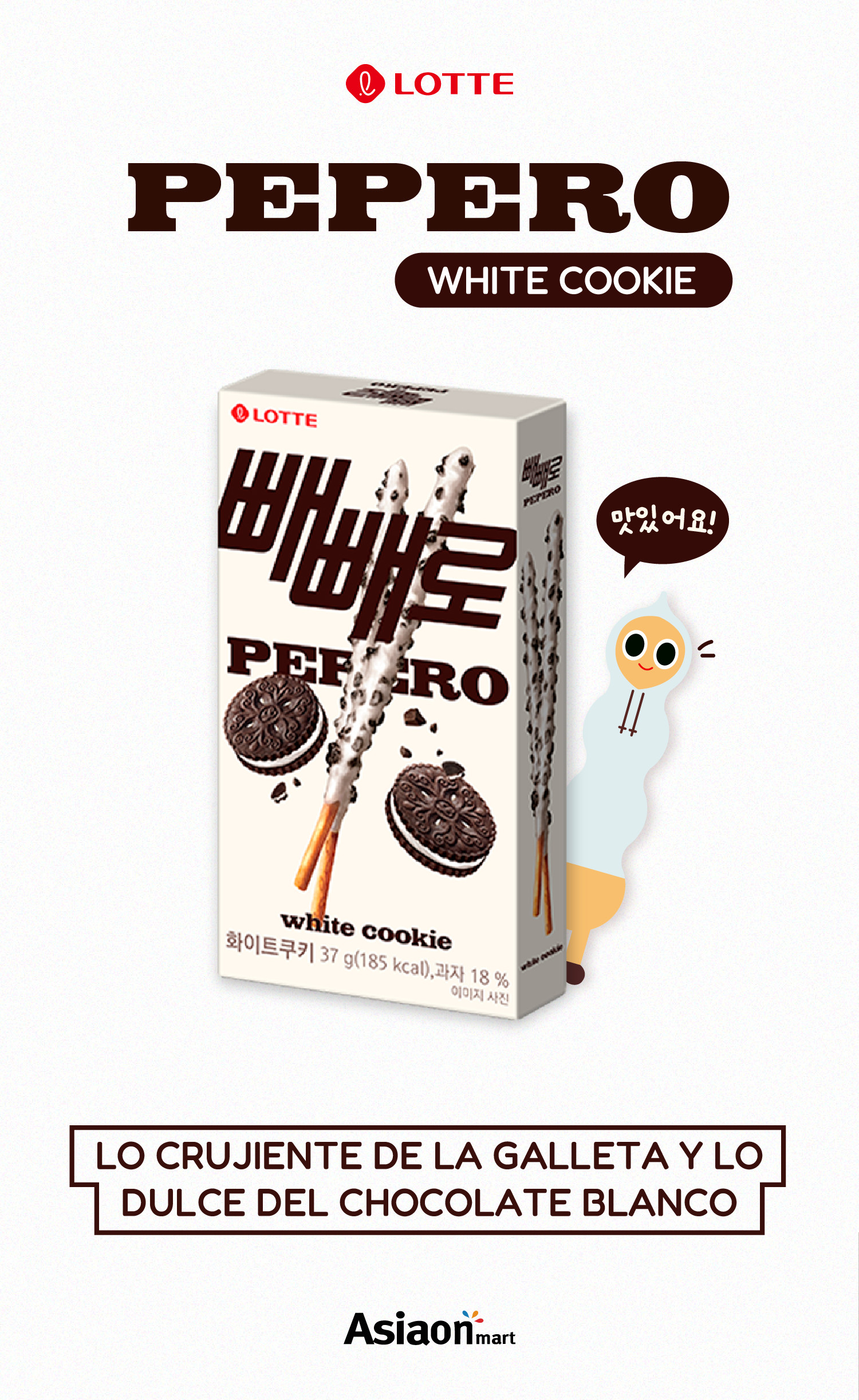Lotte Pepero Sabor White Cookie 4 Pack de 128 gr son galletas en forma de palitos, cubiertos de chocolate blanco con trozos de galleta. Una deliciosa alternativa a las galletas y chocolates comunes.