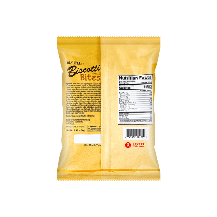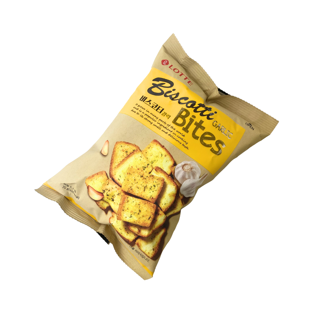 Lotte Snack Biscotti Pan Crujiente Sabor a Ajo 70 gr delicioso snack coreano de pan crujiente con sabor a cebolla, tiene una textura y sabor intenso que es perfecto para complementar tus alimentos.