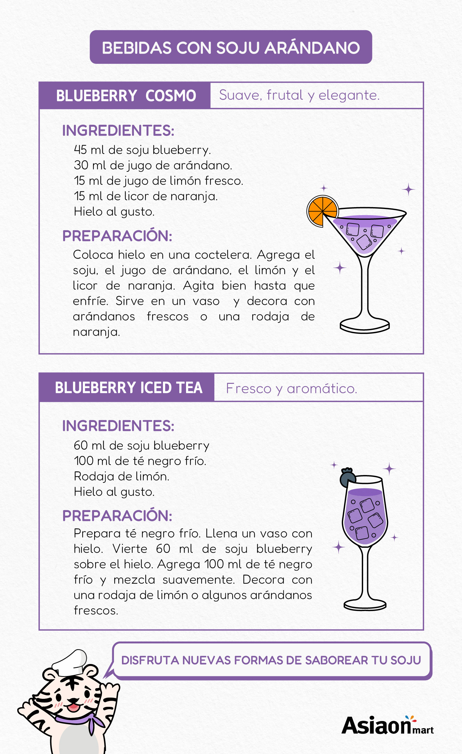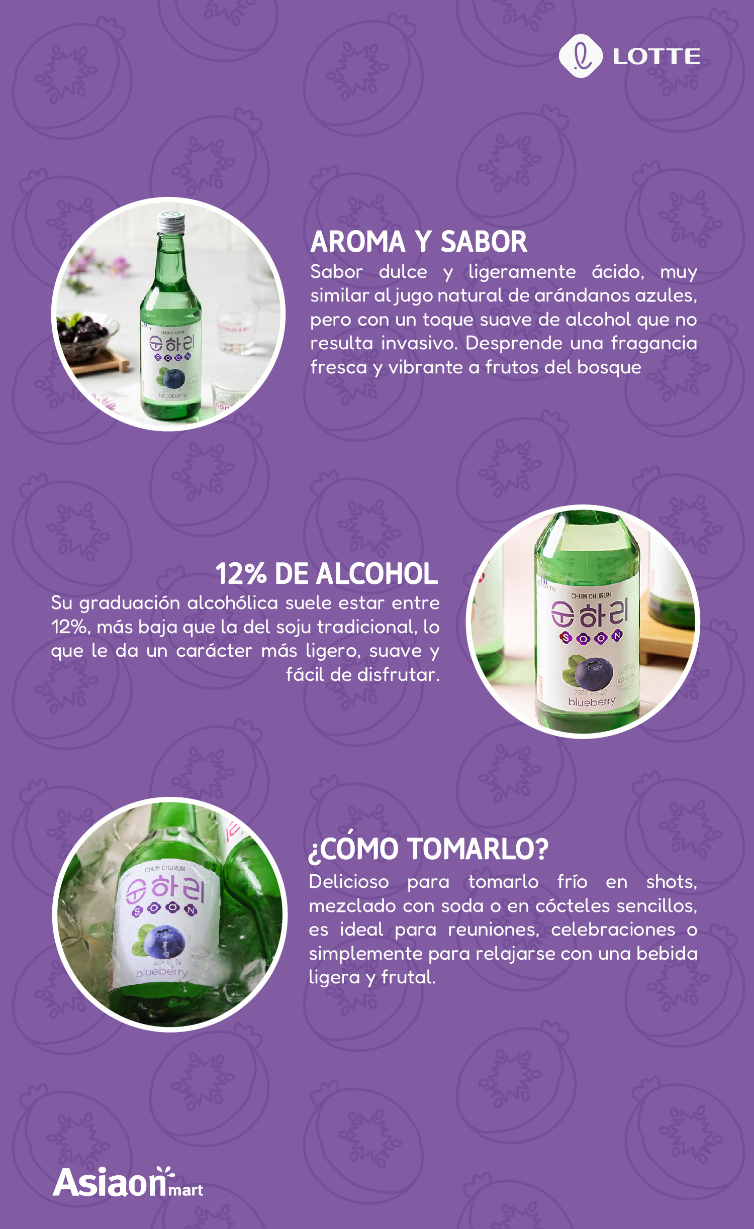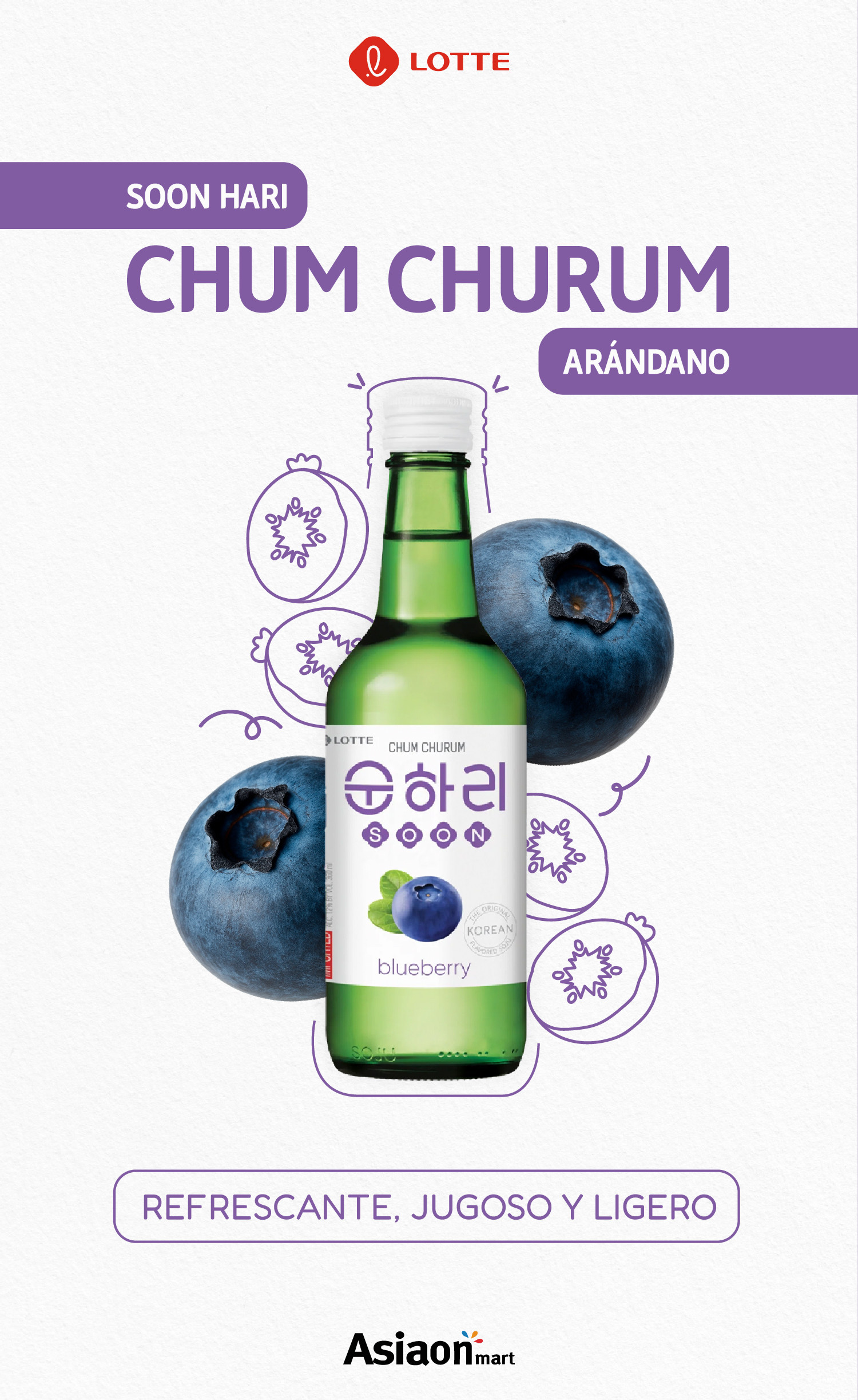 Lotte Soju Chum Churum Blueberry 360 ml licor coreano 100% puro y natural elaborado con agua mineral, arroz en grano, cebada, caña de azúcar, fructosa.