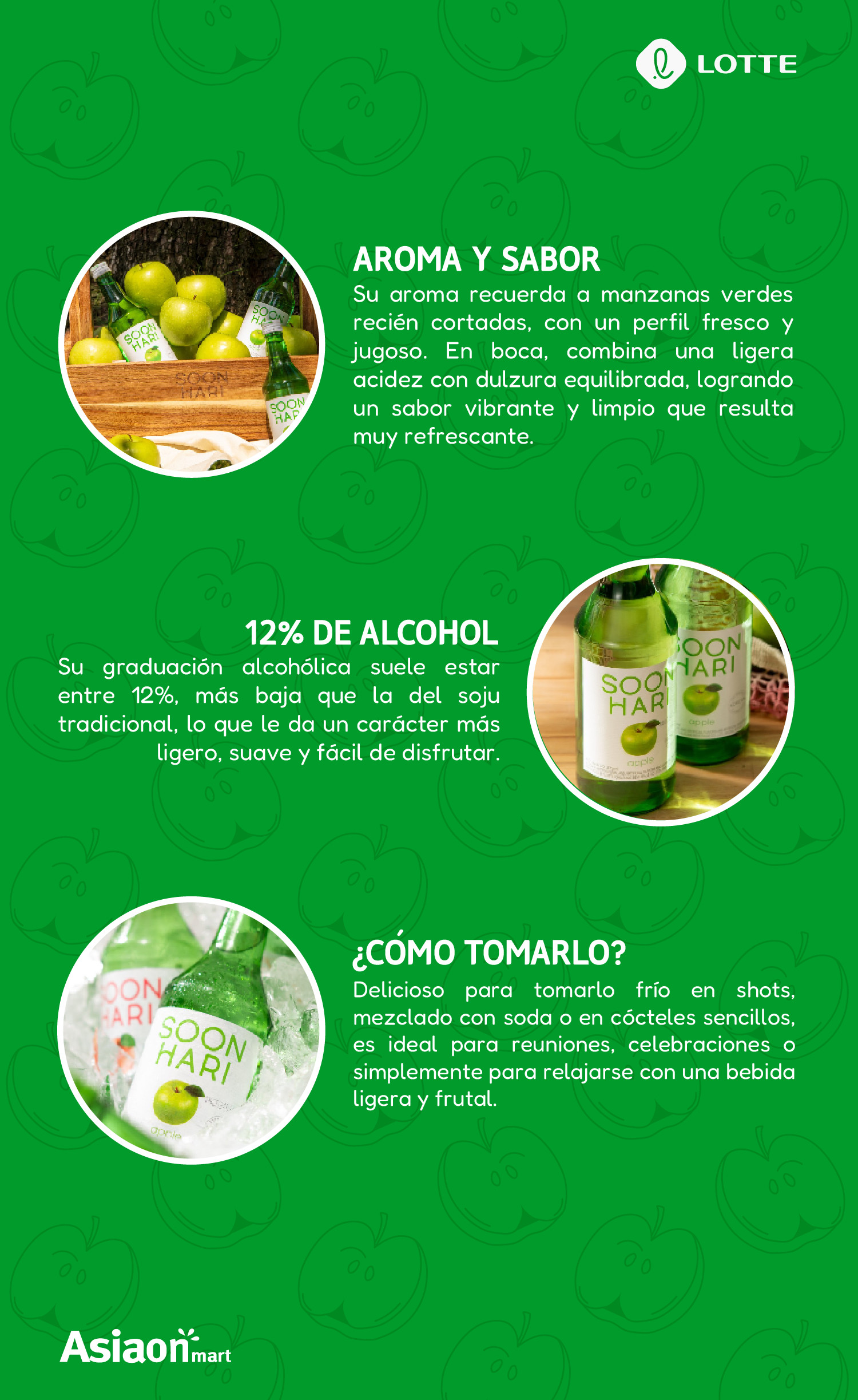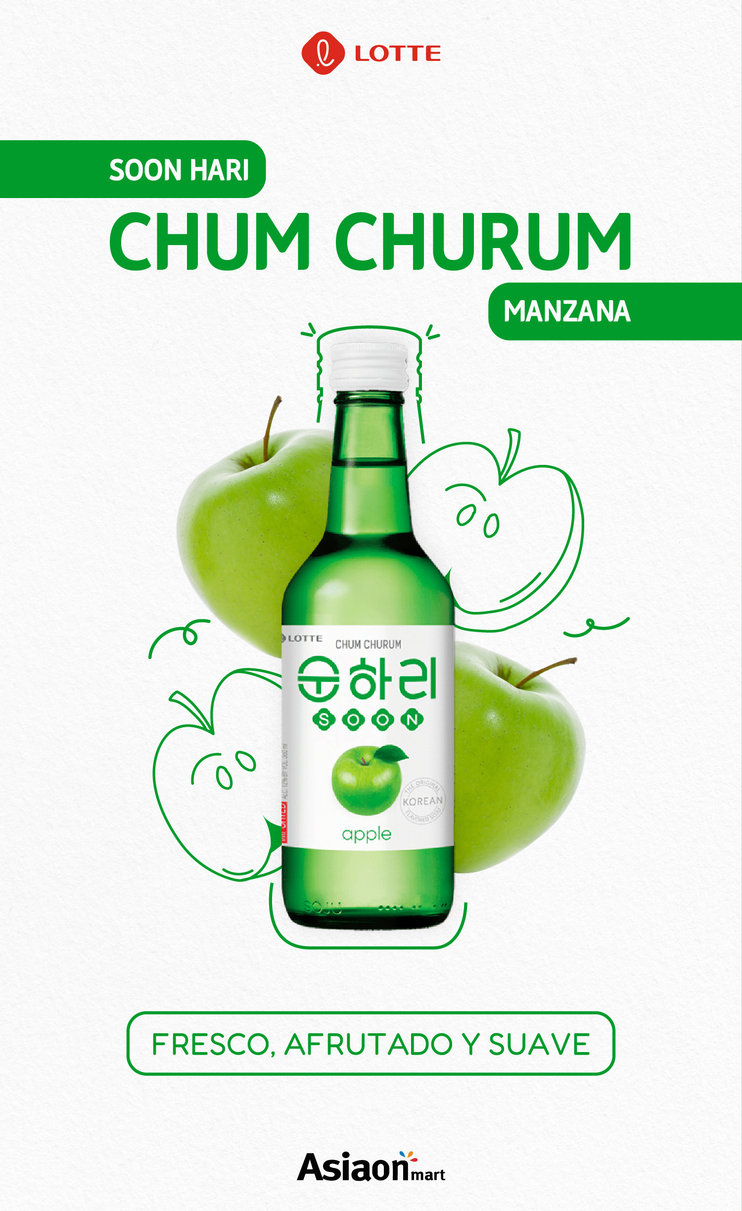 Lotte Soju Chum Churum Manzana Verde 360 ml licor coreano 100% puro y natural elaborado con agua mineral, arroz en grano, cebada, caña de azucar, fructosa y manzana verde.