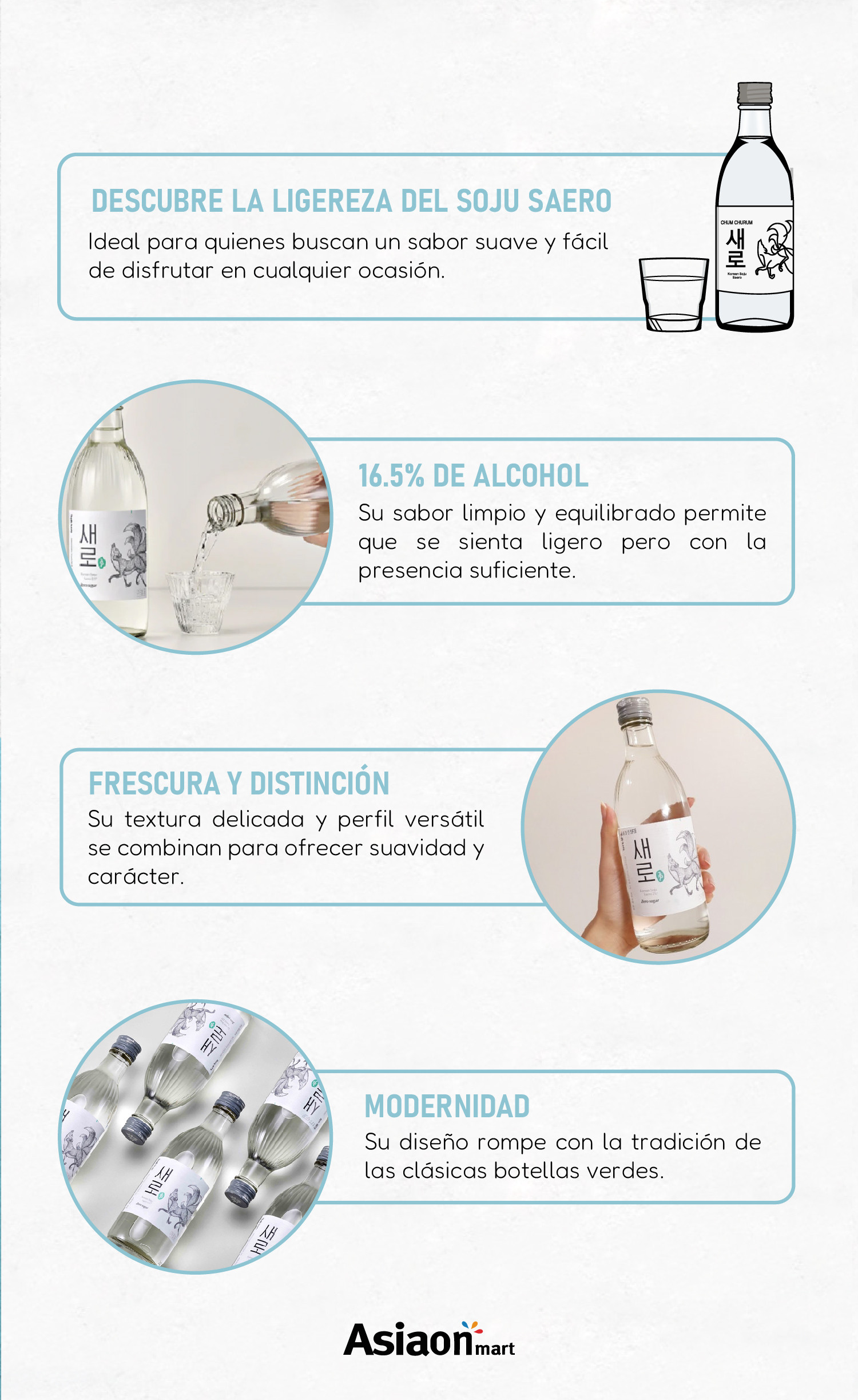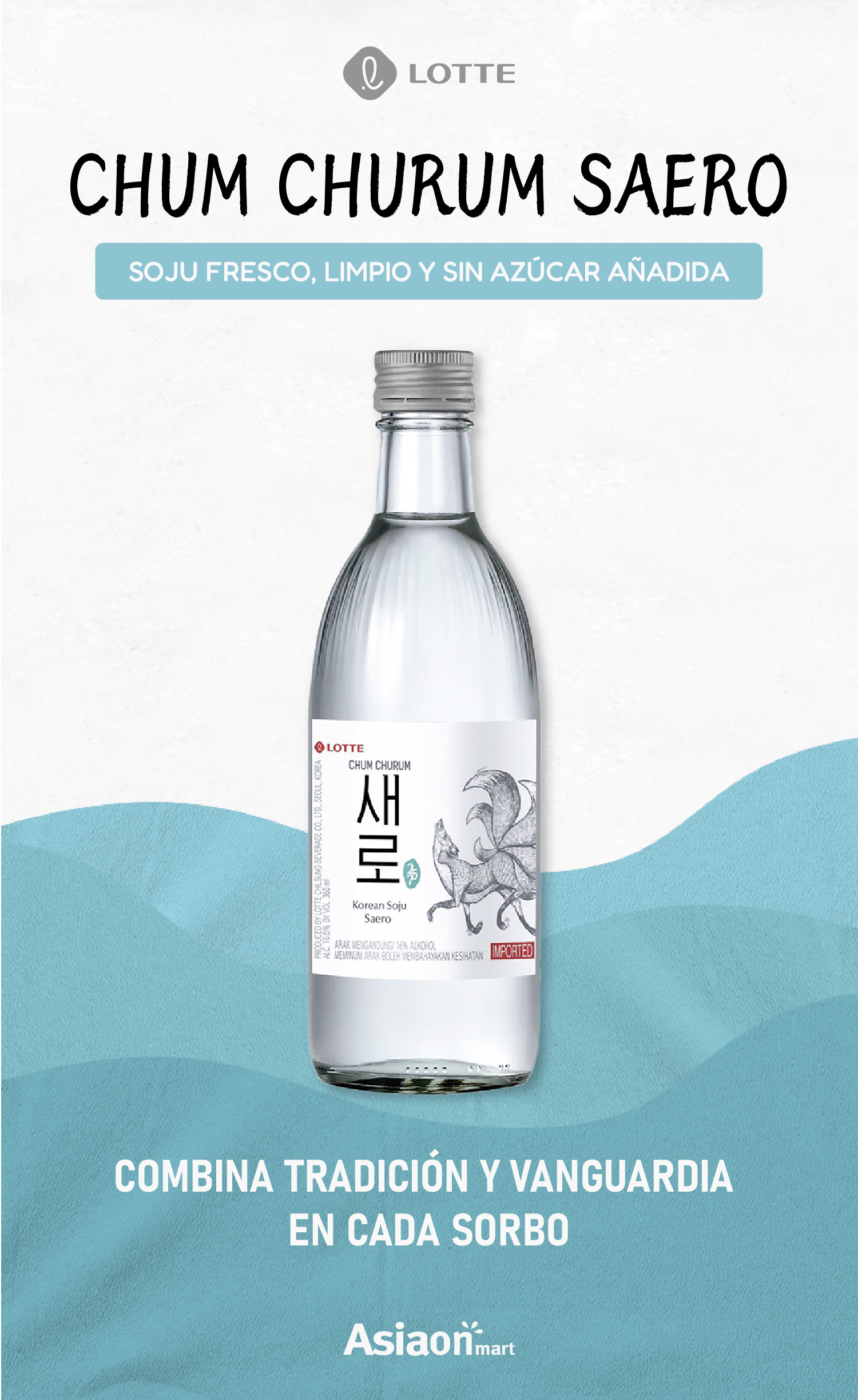 Lotte Soju Chum Churum Saero 360 ml licor coreano 100% puro y natural elaborado con agua mineral, arroz en grano, cebada, caña de azúcar, fructosa.