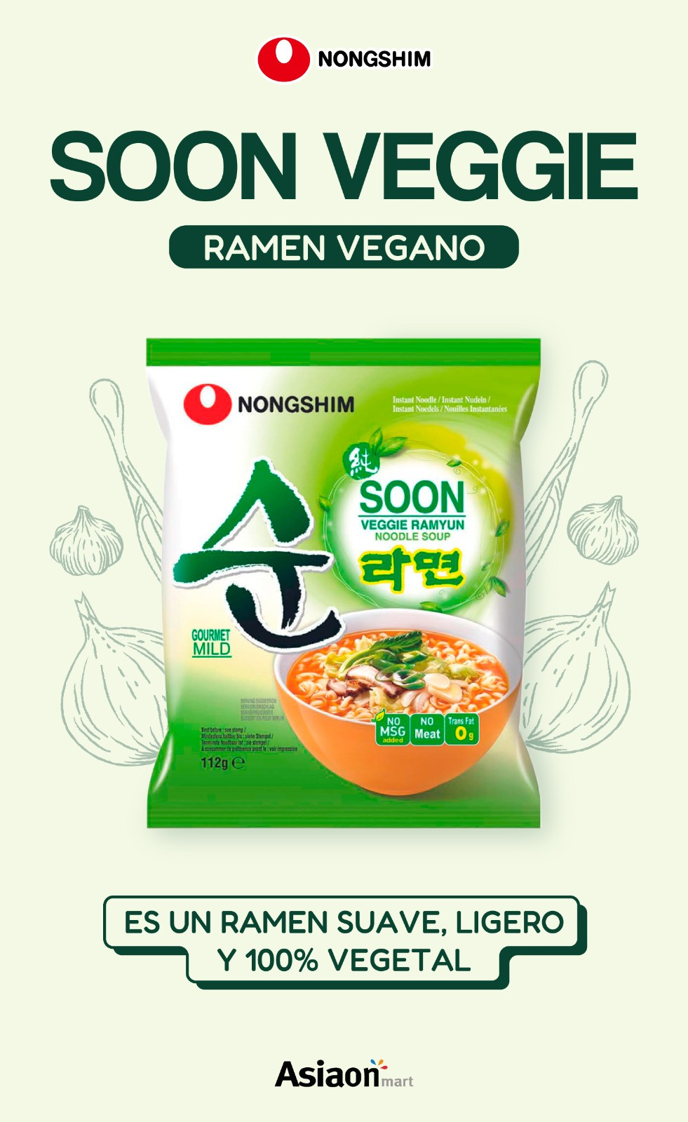 Nongshim Soon Veggie 112 gr ¡Deliciosos sabores verdes en cada delicioso remolino! Inspirado en nuestro éxito de ventas Shin Ramyun, este delicioso fideo vegano ofrece el equilibrio perfecto de sabores ricos y sabrosos, todo potenciado por vegetales saludables. Con su profundo sabor umami y su textura saciante, es tan sustancioso y sabroso que incluso los amantes de la carne disfrutarán de ello.