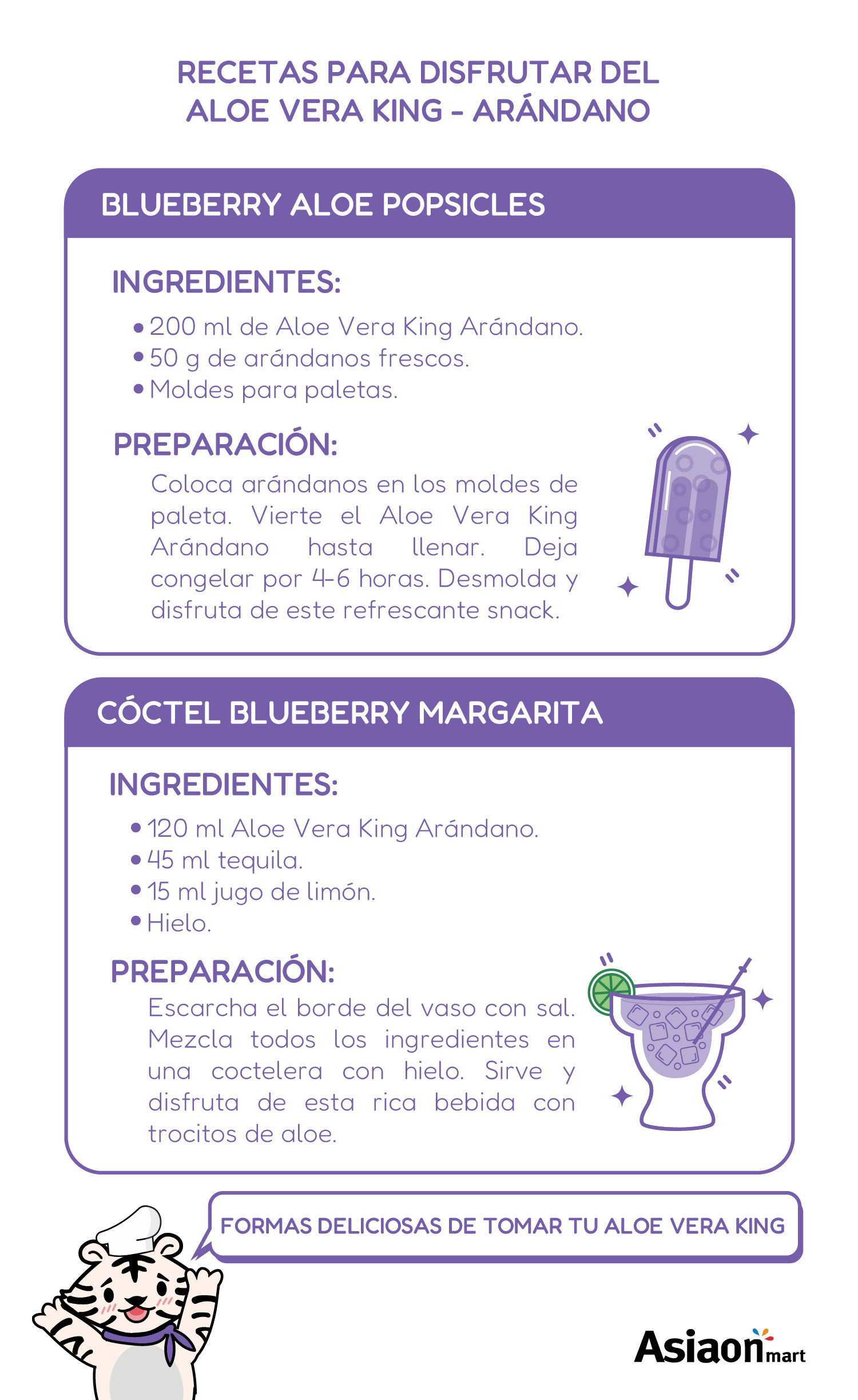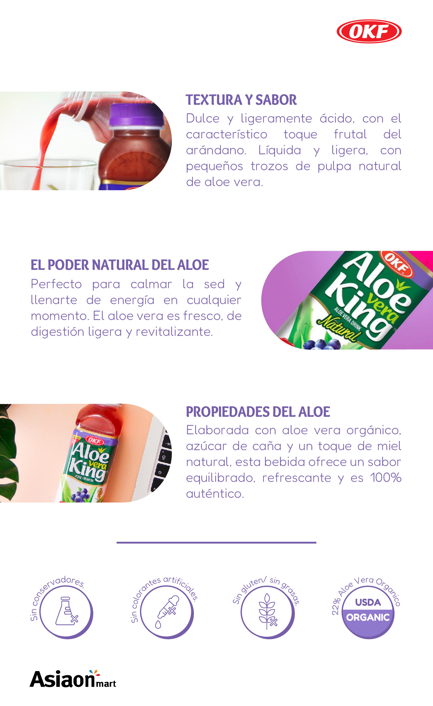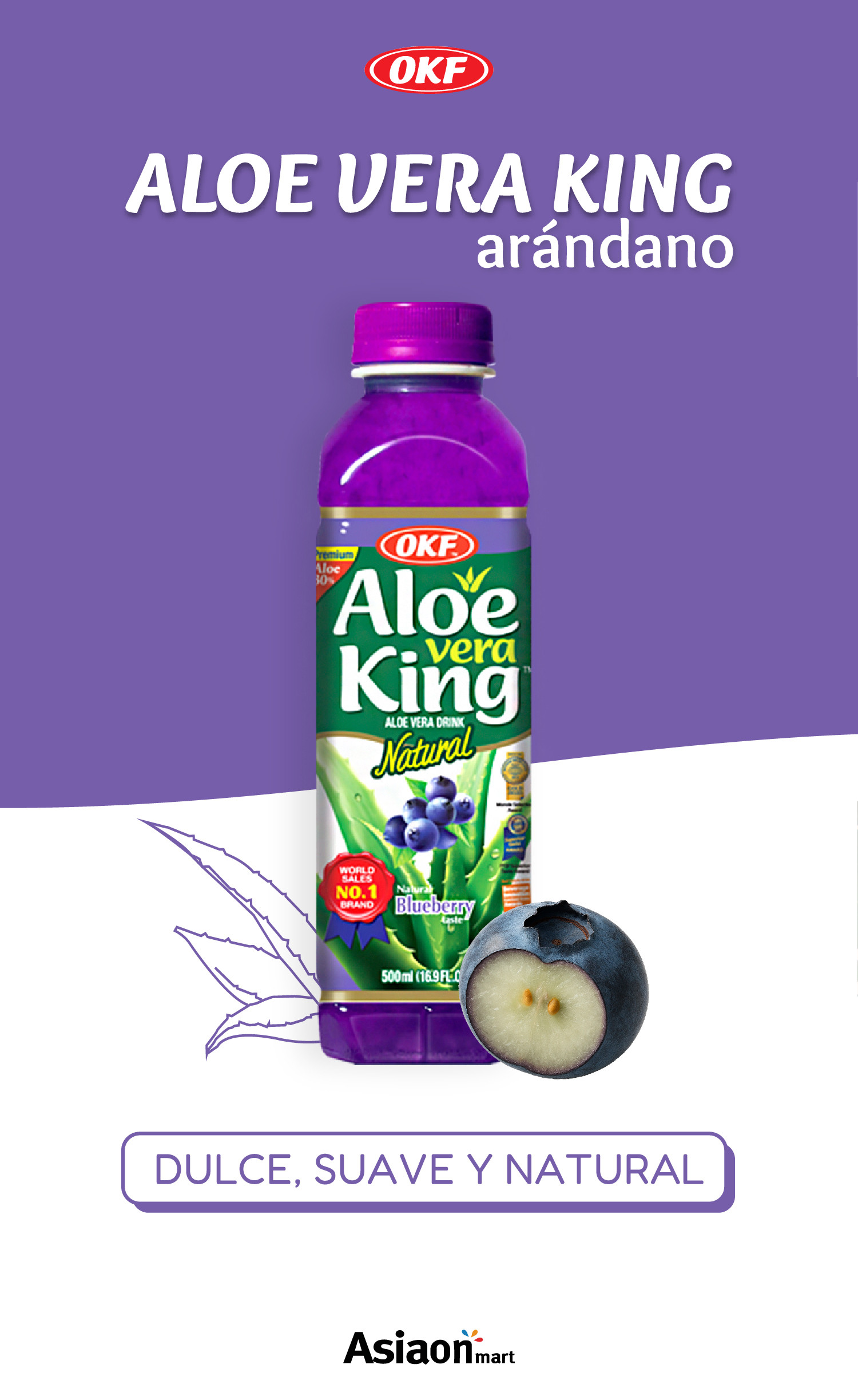 Okf Aloe Vera King Blueberry 500 ml esta bebida aporta un rico y dulce sabor a uvas oscuras que te encantará en combinación con el tradicional aloe vera con trozos de sábila.
