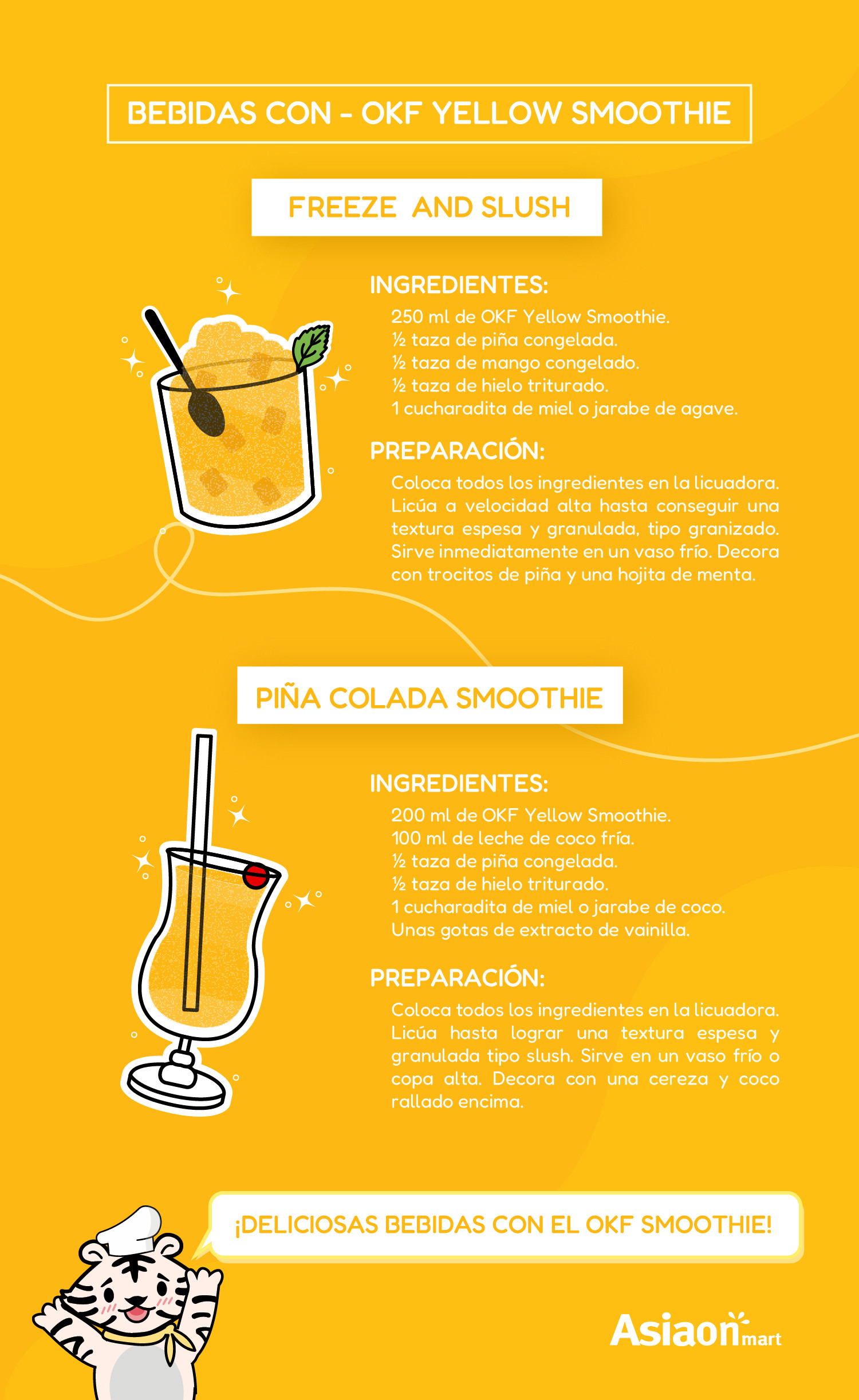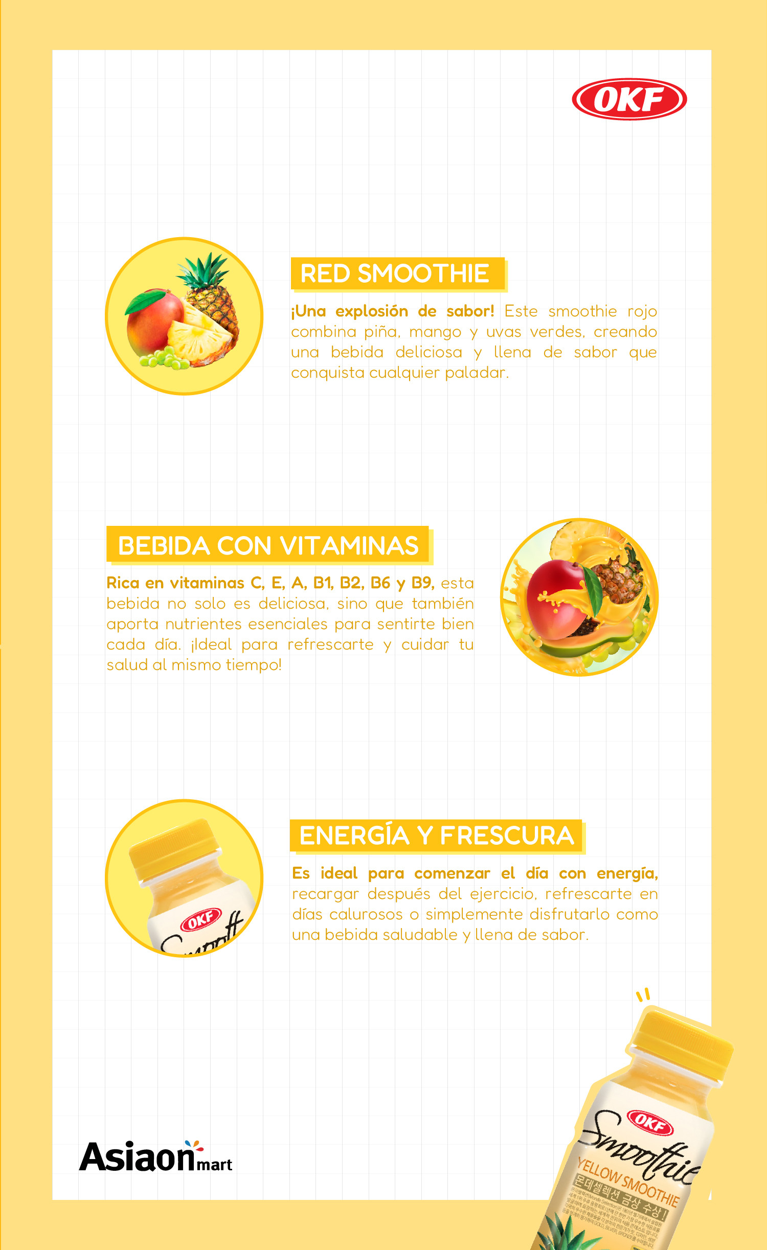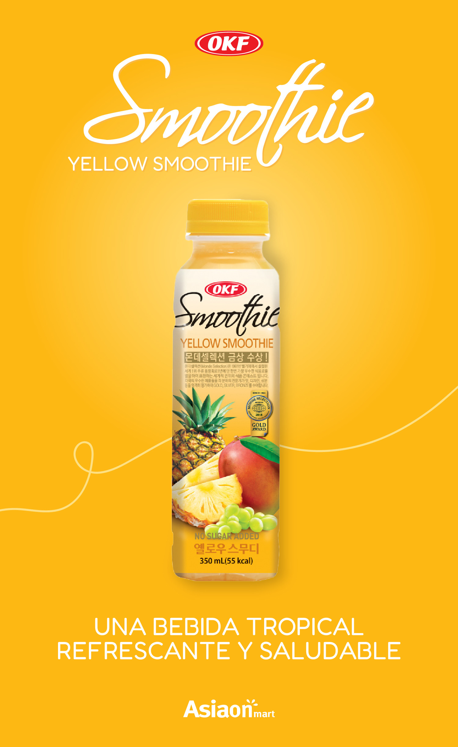 Okf Jugo Smoothie Mix de Frutas Amarillas 350 ml una bebida espesa y cremosa, el Smoothie Amarillo es una mezcla de puré de piña, uvas blancas y mango. El batido amarillo contiene Lactobacillus, que es una bacteria inocua para los humanos, lo que la convierte en una bebida saludable probiótica. Este producto también contiene una pequeña cantidad de leche desnatada.
