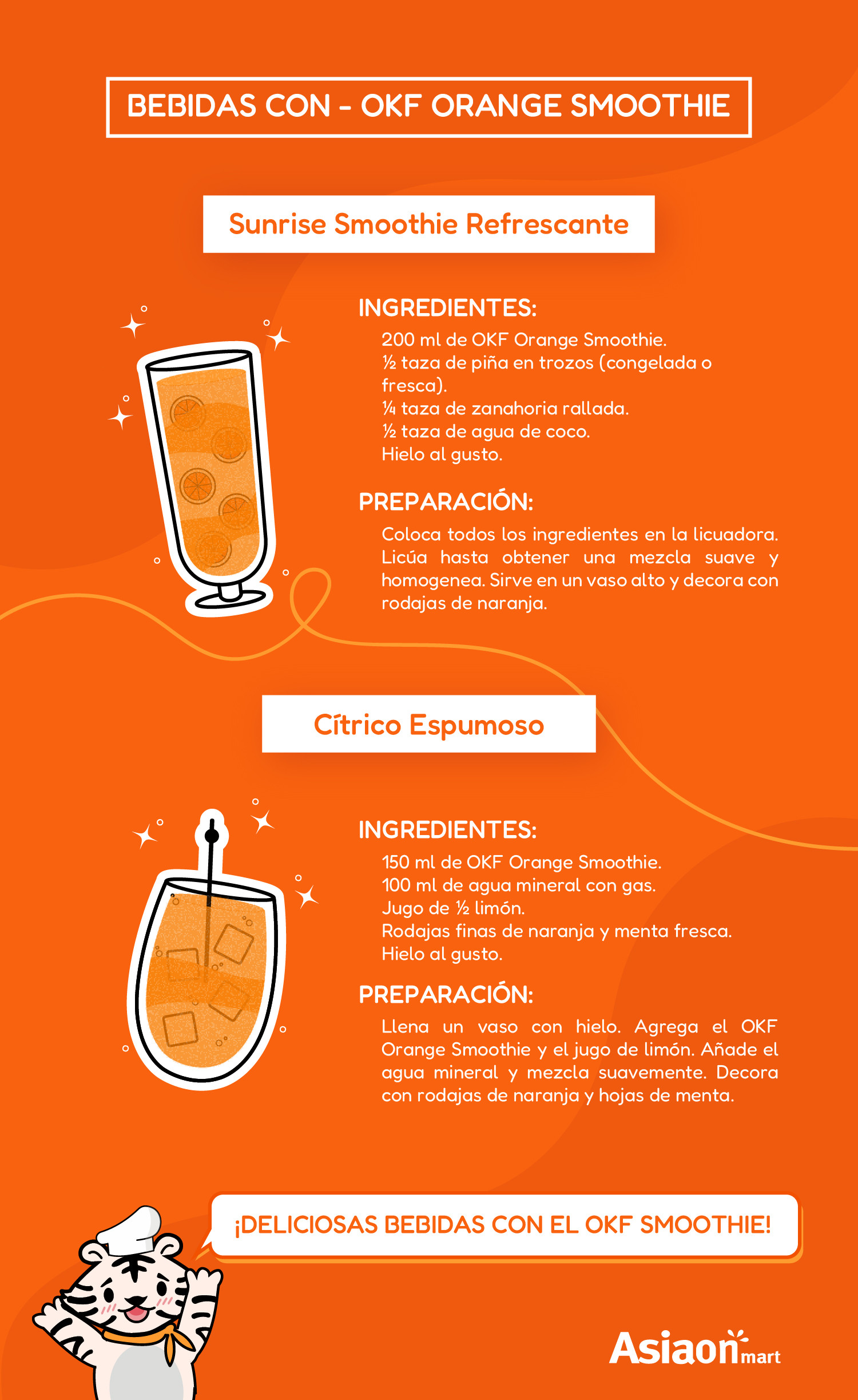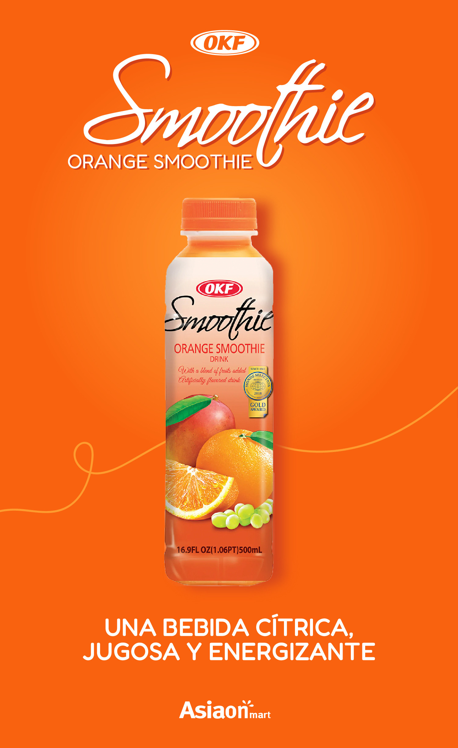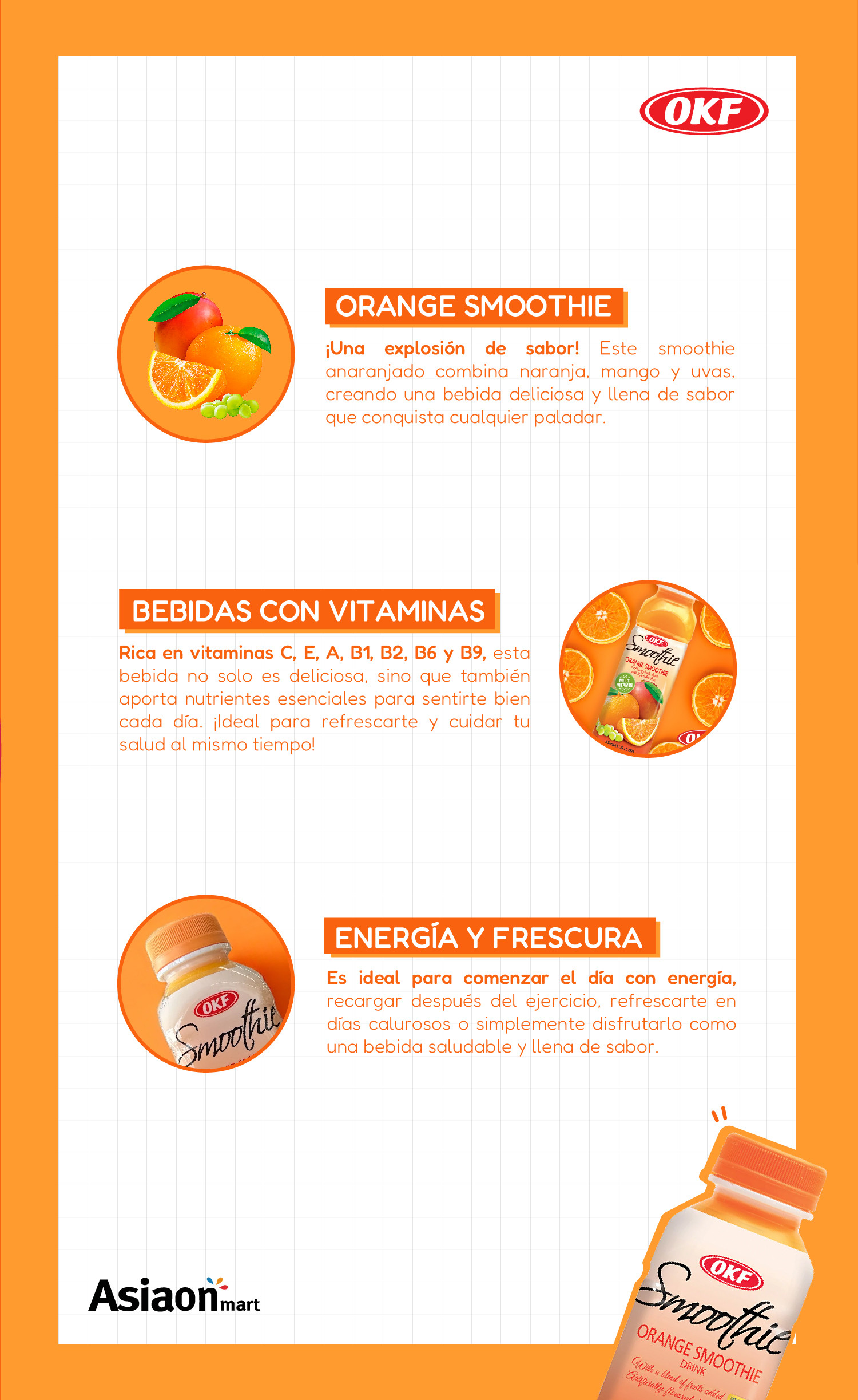 Okf Jugo Smoothie Mix de Frutas Naranajas 350 ml es una bebida espesa y cremosa, el Smotthie Mix de Frutas Naranjas es una mezcla de puré de uva, naranja y mango.El batido rojo contiene Lactobacillus, que es una bacteria inocua para los humanos, lo que la convierte en una bebida saludable probiótica. Este producto también contiene una pequeña cantidad de leche desnatada.