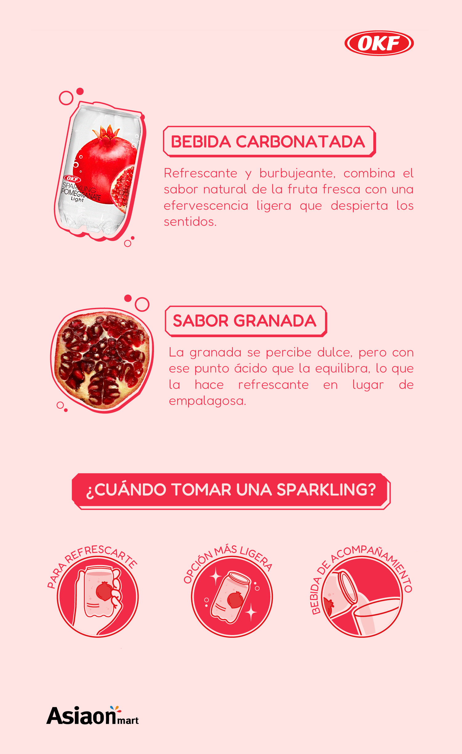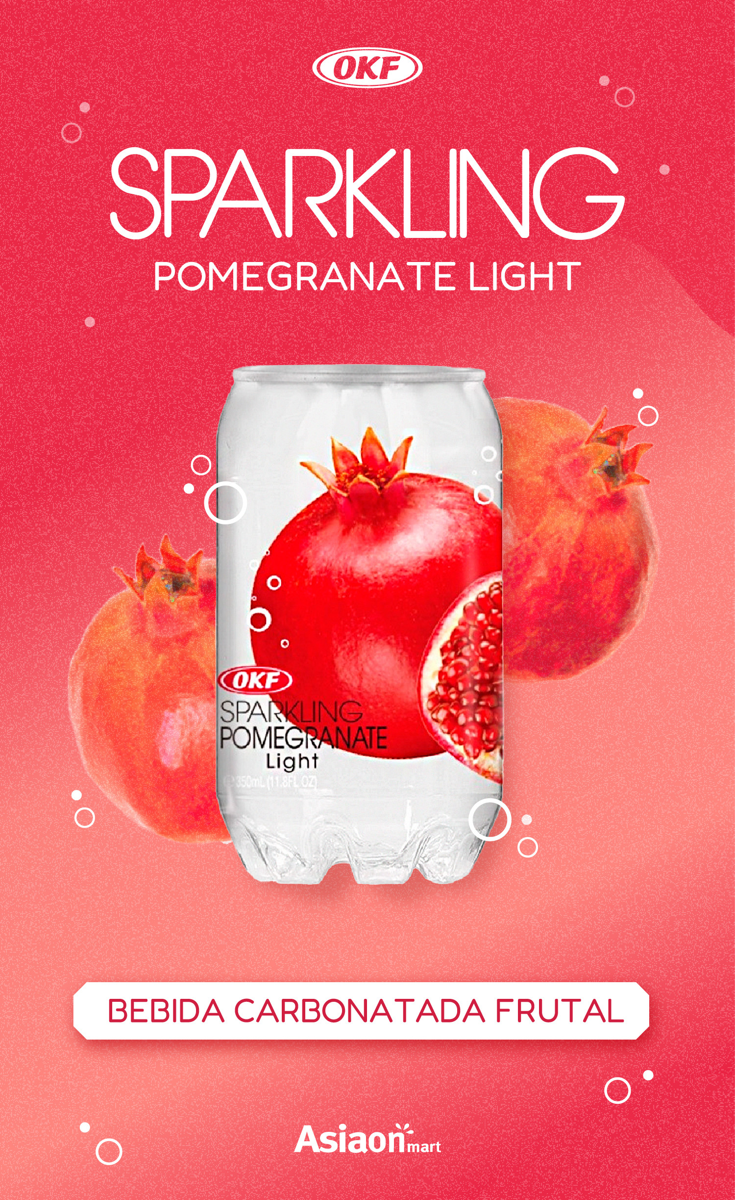 OKF Sparkling Pomegranate Ligth 350 ml el sabor auténtico de la granada en cada sorbo, sin sabores artificiales, con unas burbujas efervescentes que realzan la frescura y la experiencia de beber.
