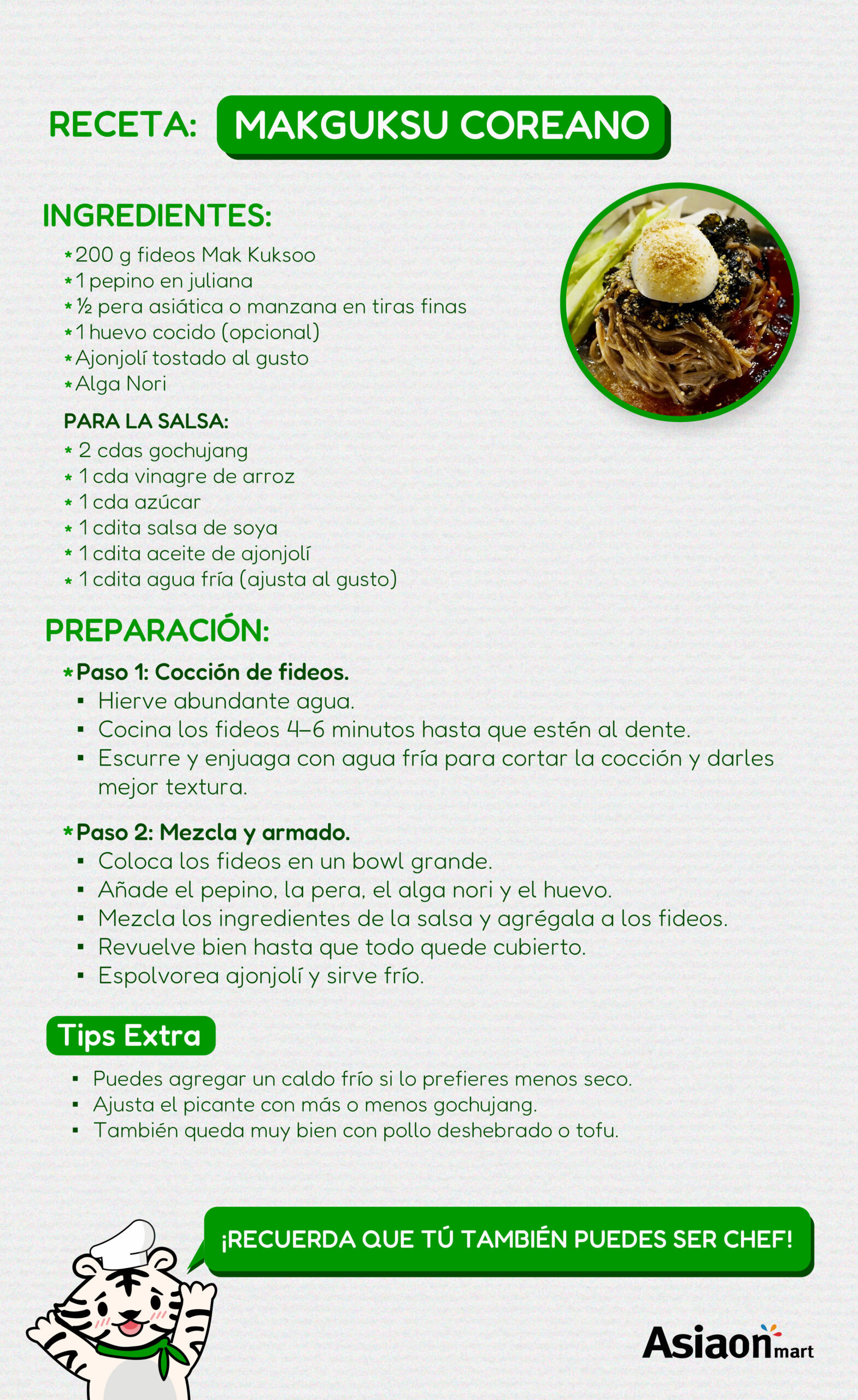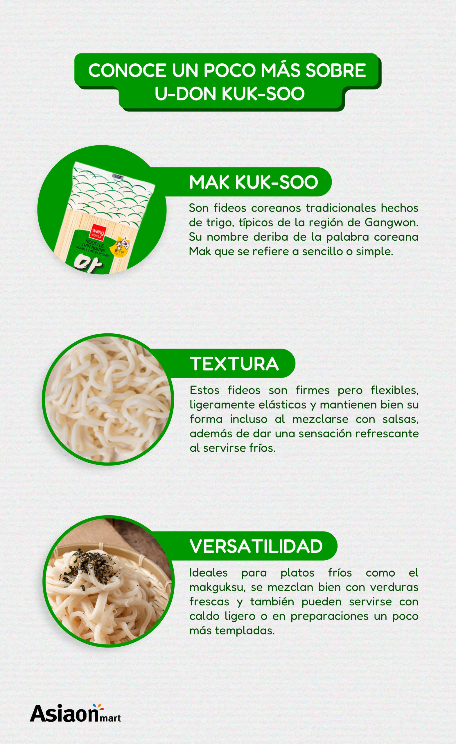 Wang Fideos Mak Kuksoo 453 gr en la cocina coreana, se utiliza en sopas de fideos frías y calientes. En la cocina Japonés, los somen generalmente se sirven frios con una salsa para mojar de sabor ligero o tsuyu. El tsuyu suele ser una salsa a base de Katsuobushi que se puede condimentar con cebolla japonesa, jengibre o myoga. El somen enfriado con hielo es una comida popular para ayudar a mantenerse fresco.